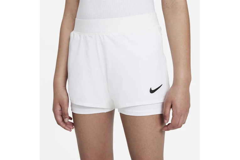 Domineer op de tennisbaan in de NikeCourt Dri-FIT Victory shorts. Het design is gericht op bewegingsvrijheid, met superelastisch materiaal en een enigszins schuine zoom zodat je comfortabel kunt sprinten en sliden.